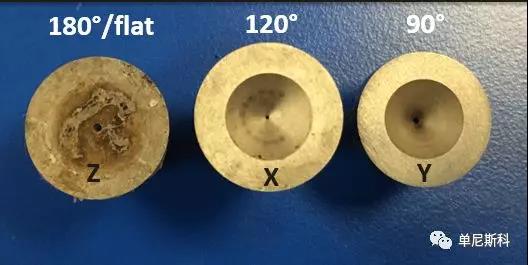 入口角對毛細口模入口處熔體的流動規律有影響。進口角較低的模具,減少了再循環角渦的形成,降低了口模進口的不穩定流動和能耗。較低的角度有利于剪切流動,降低了聚合物熔體的彈性變形。單尼斯科提供了60°(W)90°(Y)120°(X)180°(Z)四種入口角度的毛細管口模,下圖為三種不同入口角度的口模。