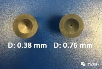 口模直徑對流變儀剪切速率的適用范圍有影響。單尼斯科提供的毛細管口模直徑從0.3mm3.00 mm不等,也就是說,流變儀能夠產生0.02277000不等的剪切速率。通常直徑為0.75-1.5mm的毛細管口模提供的剪切速率與擠出或注射成型過程中的剪切速率相匹配。較大直徑的口模具產生較低的剪切速率,并減少入口壓降、滑移、拉伸變形和模具膨脹。下圖顯示了兩個直徑不同的口模。